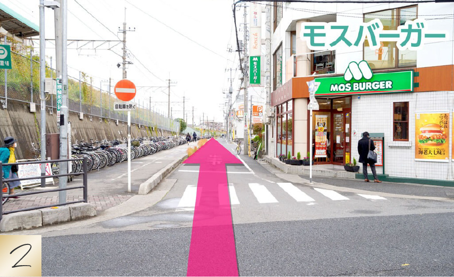 モスバーガーの交差点を、線路沿いに直進します。
