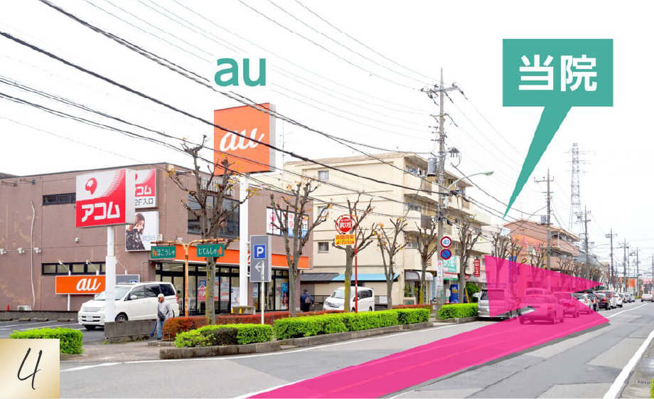 auを通り過ぎます。あかしば保育園の手前が当院です。