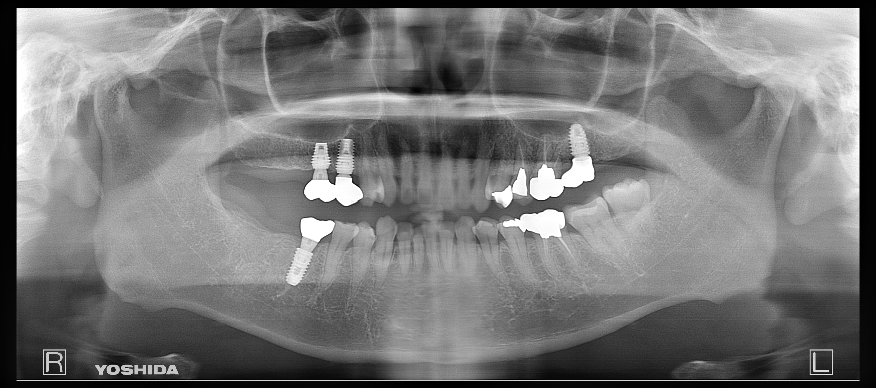 今回は抜歯をせずにしっかりとかめることを目的に本数を少なくしたインプラント治療となりました。
